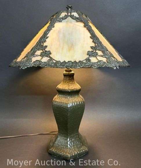 LOT 28 - Metal Table Lamp with Slag Glass Shade, 24"h