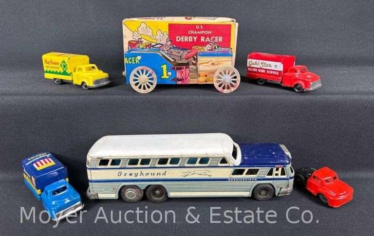 LOT 588 - Greyhound Bus, US Metal Toy Derby Racer (with Original Box), with 3 Other Tin Trucks, 4"-10.5"w
